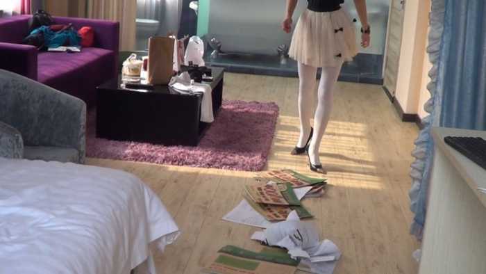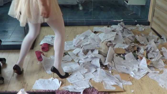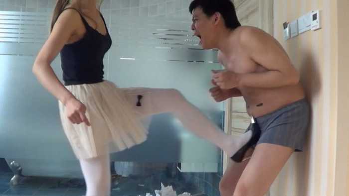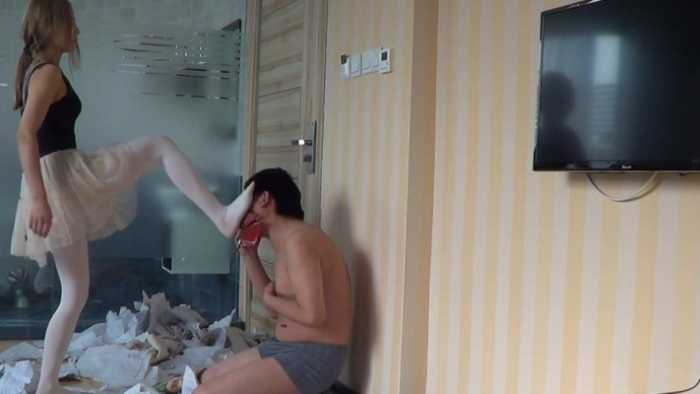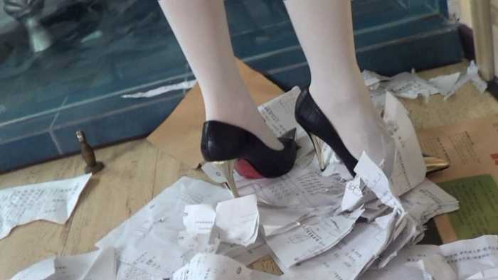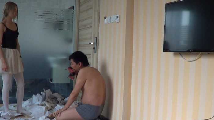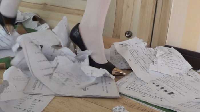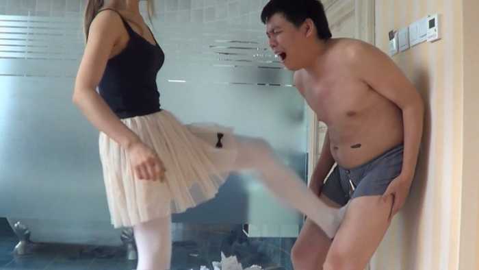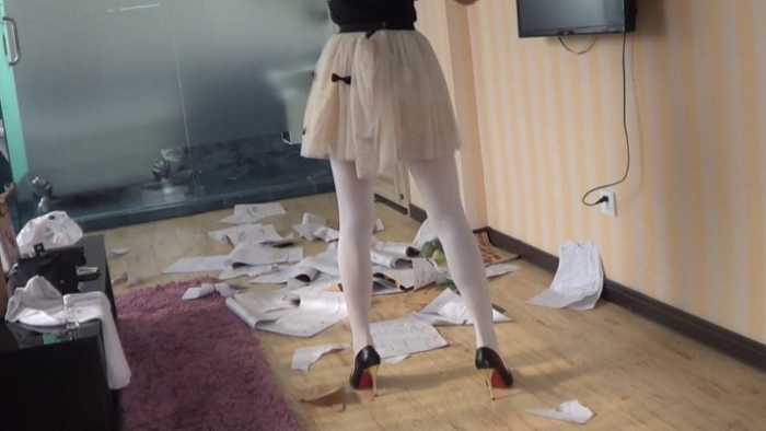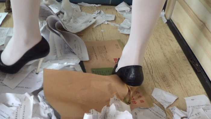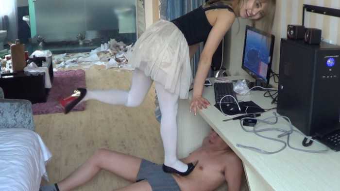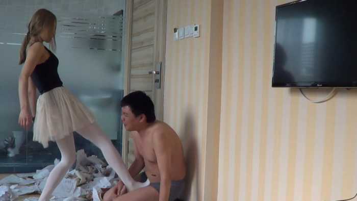 内容:女混混非常讨厌书呆子,她把这个书呆子新买的50本练习册抢来,丢在地板上,她穿着金属细高跟鞋,把他的练习册全部碾碎。不仅如此,她还脱掉了书呆子的衣服,用香烟烫个窟窿,并把他的衣服丢在地上践踏。可怜的书呆子恳求这个女混混不要破坏他的练习册,女混混骗书呆子:你跪下闻我的鞋,闻我的丝袜脚,我就饶了你。