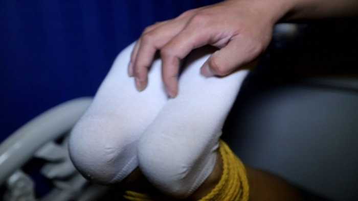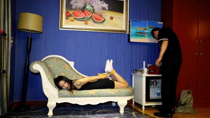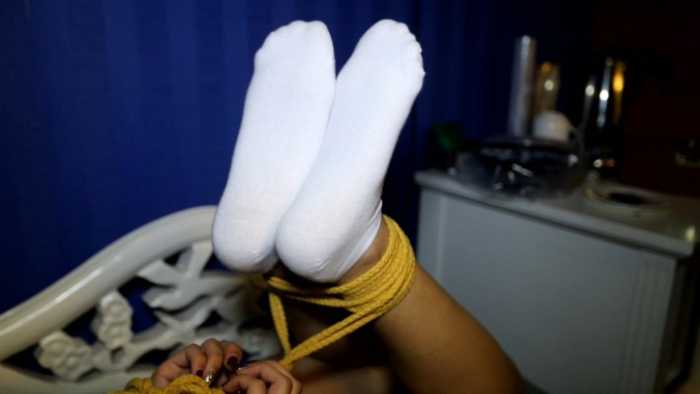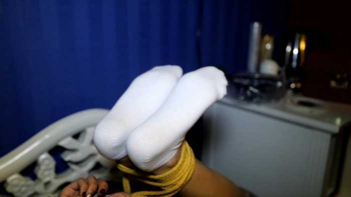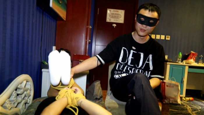 喵了个咪在家穿着大皮靴愉快的刷着TBao,这时强盗大哥冒充送快递的敲门,喵毫不怀疑的跑去开门准备新一轮拆包,么想到强盗大哥手里拿着绳子就冲进来,不由分说把喵推到沙发上强制脱靴子,然后一顿捆绑。喵还在想我特么是喵又不是熊猫也没点外卖,这咋的笋还到到家了啊?喵以为强盗要劫色,没想到却是劫财,大失所望心里骂这还真特么是损到家了。强盗把抽屉柜子一顿翻也没找到点值钱货,只好来逼问,喵不说,强盗想方设法挠脚心逼问,虽然喵很怕痒,但是强盗始终没有搞定,后来强盗觉得应该是她脚上的白棉袜太厚了,于是脱下喵的白棉袜,还给换了超薄丝袜穿上,继续挠,还是无果。强盗大怒,按住喵挠全身挠腋下,喵实在是挺不住了。。。。