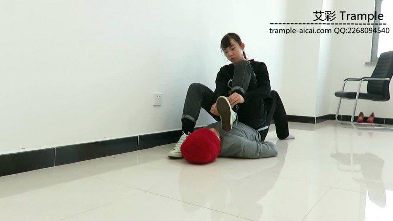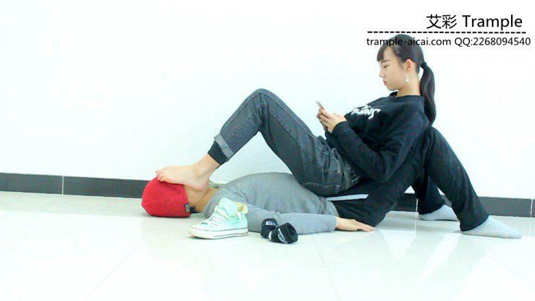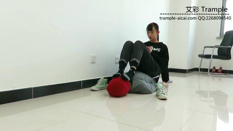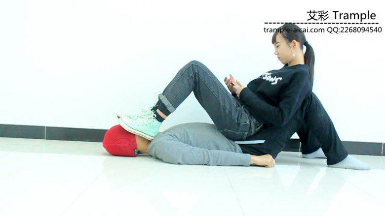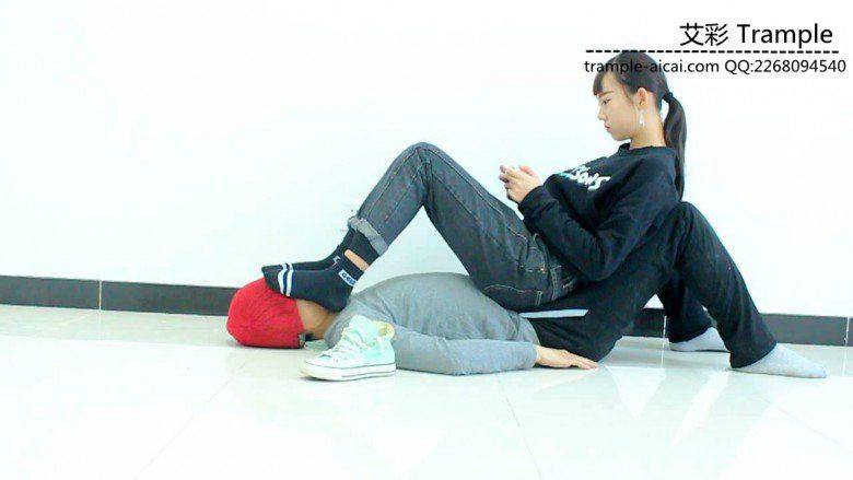 帆布鞋坐在人体家具上玩游戏,脚下热了脱下鞋子,用棉袜在贱狗脸上把汗蹭一蹭,然后裸足让贱狗边舔边玩!