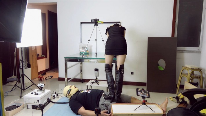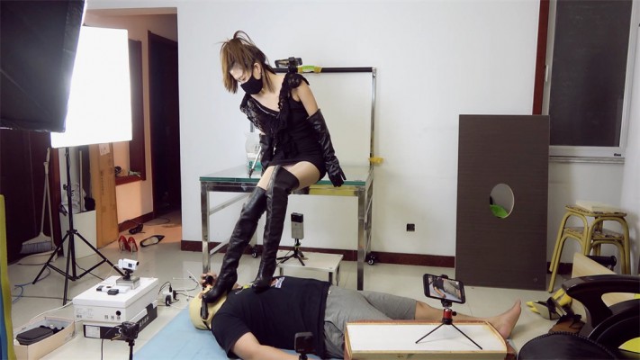 晓G手里拿着皮鞭 穿着黑色过膝长靴以及长靴里的肉色丝袜。皮革手套 让她看起来格外的冷酷无情~! 晓G 的走到奴隶身边 看到我害怕吗?恐惧吗 ?说着晓G直接站在奴隶的身上 踩死你~