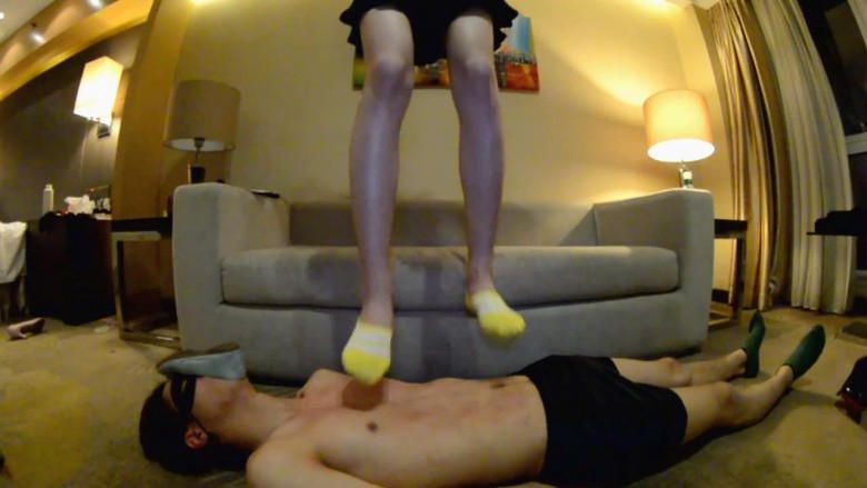 内容:①双脚从沙发跳到身上(同时落地)②把鞋反扣在脸上,强制闻气味。踩着鞋子站头上 ③蒙住奴隶双眼,脱了袜子甩在奴隶脸上,在奴隶毫无准备的情况下跳下来