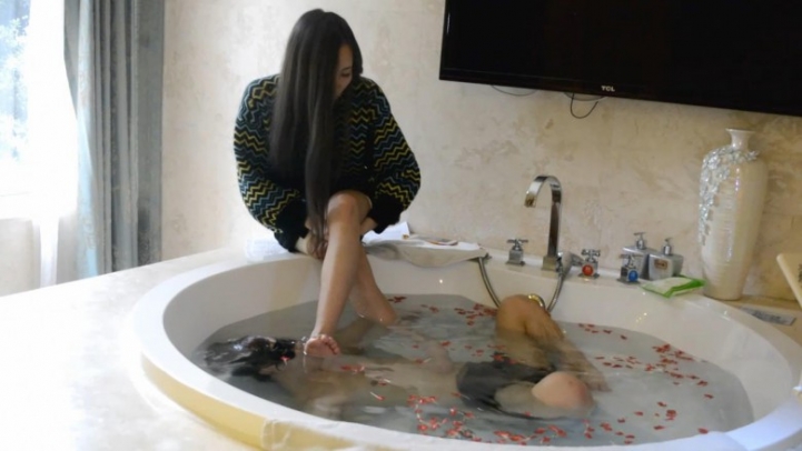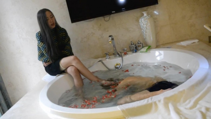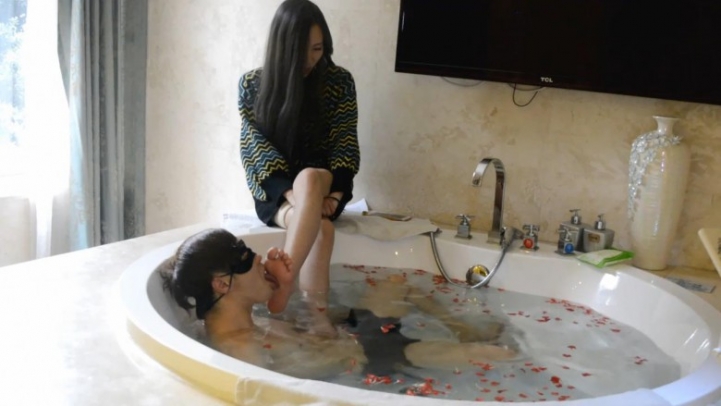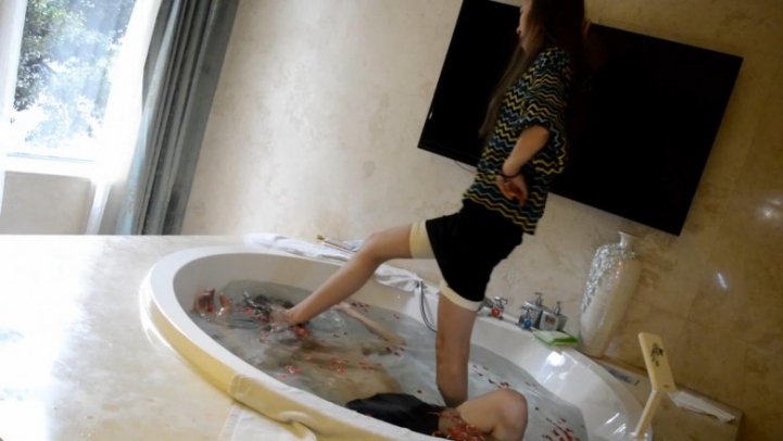 主人坐在浴缸边上,脚伸到浴缸里,命令奴隶用舌头洗脚、插嘴。可是主人坏坏的故意慢慢把脚浸入水中。舔的不满意,就把奴隶的头踩进水里。又命令含着水用脚插嘴。后来还把奴隶整个踩到水底窒息。奴隶最后休克了那么一下,说有回光返照的感觉