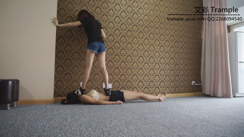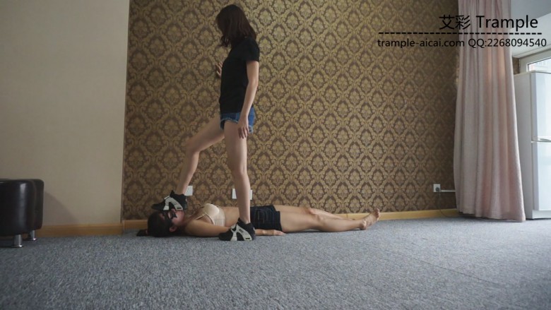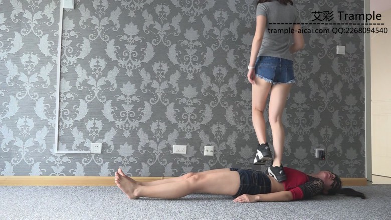 白棉袜黑色运动鞋全体重践踏,全体重踩胸部,脸,头,肚子,裆部,姿势优美,女王气质。之后让女M舔运动鞋边缘