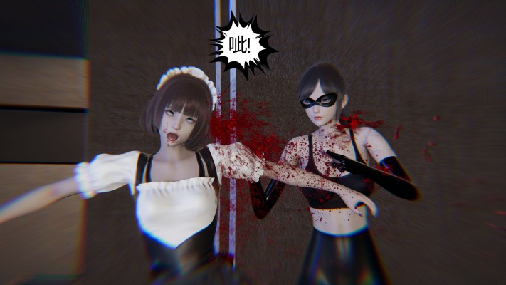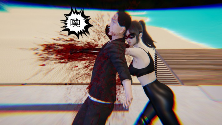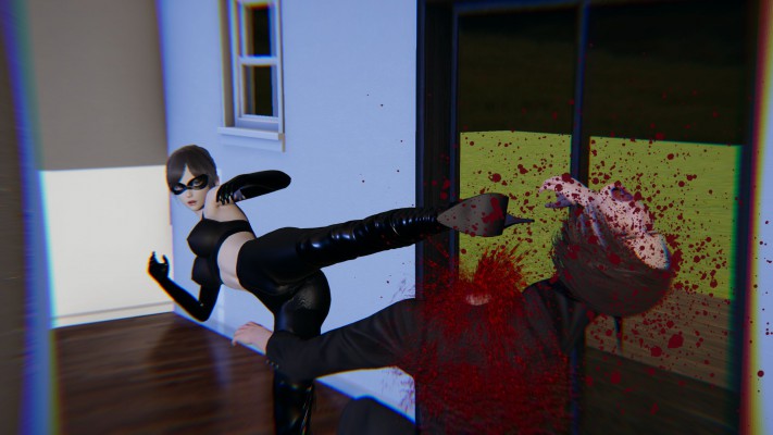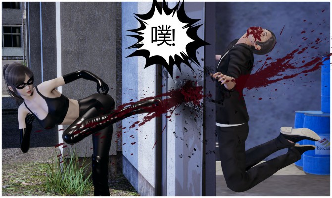 猫女打开门走进去,门里的其他人向猫女开枪,没想到猫女全身衣服都是特殊材料制成,刀枪不入。猫女微笑着跳起来,落下时猫女倒立着,双手撑地,双腿张开,双脚的靴跟朝外,然后双手撑地边移动边旋转,不断改变双腿张开的角度,用靴跟割开这群人的脖子,有的人直接连头都被踢飞,有的人则是被开膛破肚,内脏流了一地,有的人手臂、头都被切了下来。这群保安发出惨叫,大喊着:“别杀我!”“我还不想死!”“我投降!”等。有一个人双手举在前面向猫女求饶,猫女毫不理会,倒立旋转着先是切掉了这个人的双手,然后划开这个人的双眼,最后切断这个人的脖子,将头踢飞。很快就只剩四个活口。猫女仍然双手撑地倒立着,用左脚踩着其中一个保镖的头固定在墙上,猫女的身后一片残肢断臂,血流飞溅的场景,猫女的双手,还有脚上都沾满了鲜血。