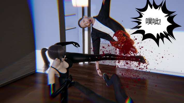 猫女走到厂房门口,敲了敲门,门后的保镖问:“是谁?”猫女立刻踢出右腿,先贯穿房门然后贯穿门后保镖的胸口,猫女的长靴从保镖背后穿出,大量鲜血喷出,猫女的脚背上沾满了鲜血,很多鲜血还在从猫女的脚上往下滴。门内的其他人都被这一幕吓呆了,举起枪瞄准门口。猫女收回长靴,又有很多鲜血流出,保镖口吐鲜血倒地。(希望可以看到门内保镖的第一视角,一只靴子插进了自己的胸部)