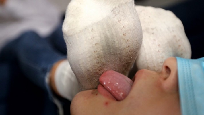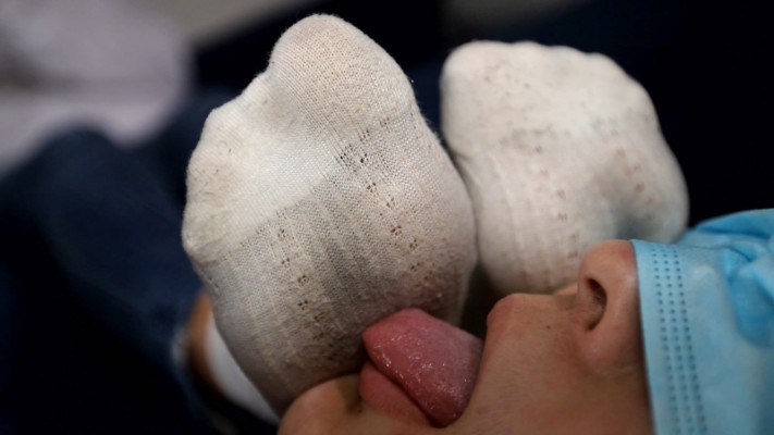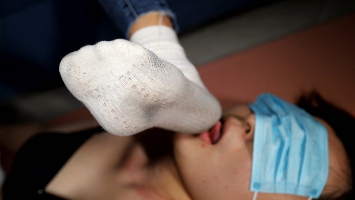 袜子已经熬成极品货了,脚垢和鞋里的污渍都渗入到袜子的每根线里,越臭母狗越喜欢。母狗伸舌头舔袜子,舔的不够彻底,脚尖插进嘴里搅动。为了让母狗好好消化我袜子里的精华,那就踩肚子吧,把它当楼梯一样踩,反复的上下跑,跳,踩的母狗时不时的哀嚎。这么脏臭的袜子肯定是舔不干净了,最后赏给母狗塞进嘴里