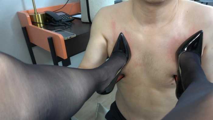 女顾客来取定制的高跟鞋,售货员取出并帮穿上,过程中多次揩油女顾客,女顾客发现后要举报让售货员丢掉工作,售货员苦苦求饶后答应可以任意处置。女顾客定制的高跟鞋是12公分红底恨天高,专门用来虐贱狗的,并说明自己就是女S,今天就要用这双恨天高踩踏售货员,全体重踩踏,蹲踩,鞋跟转圈踩等踩踏乳头,人畜无害的外表下踩起人来十分狠毒,售货员十分痛苦,女顾客踩的还挺开心的,丝毫不顾售货员感受。