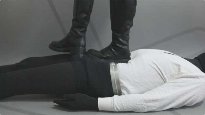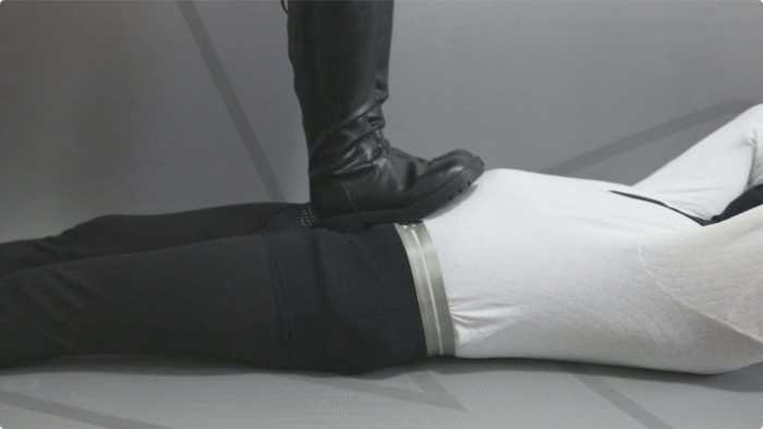 大皮靴子踩着包皮男肚子,让他做仰卧起坐。