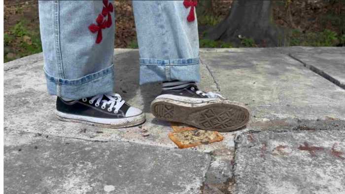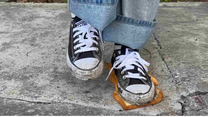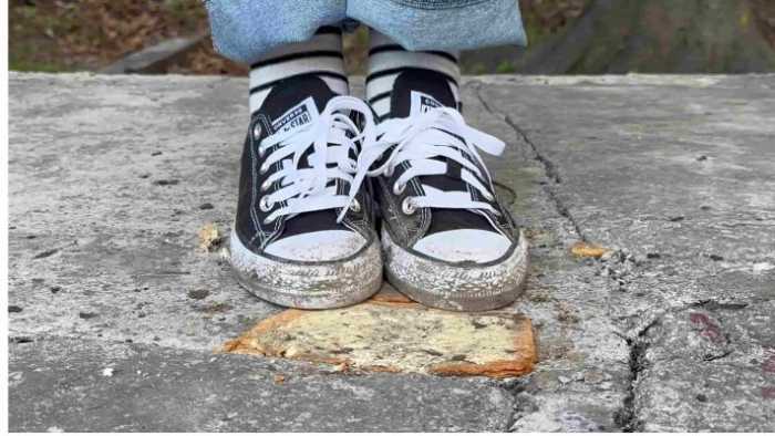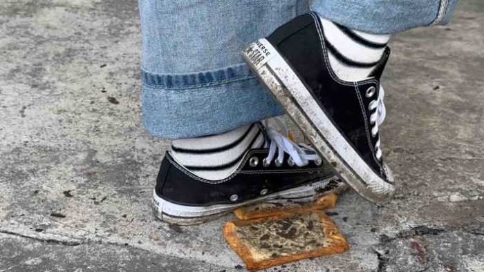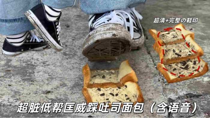 定制视频,穿的超级脏的低帮匡威给狗子制作吐司面包。面包没有像以往的视频里那样踩得稀碎,只是在每一片面包上都留下了清晰的脚印,但是还是完整的一大片。
