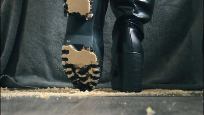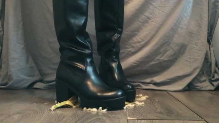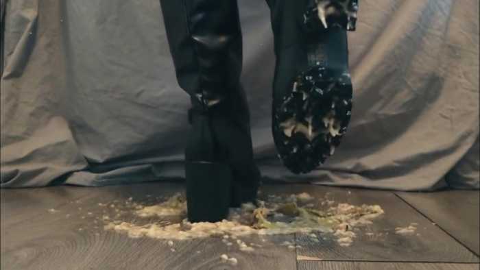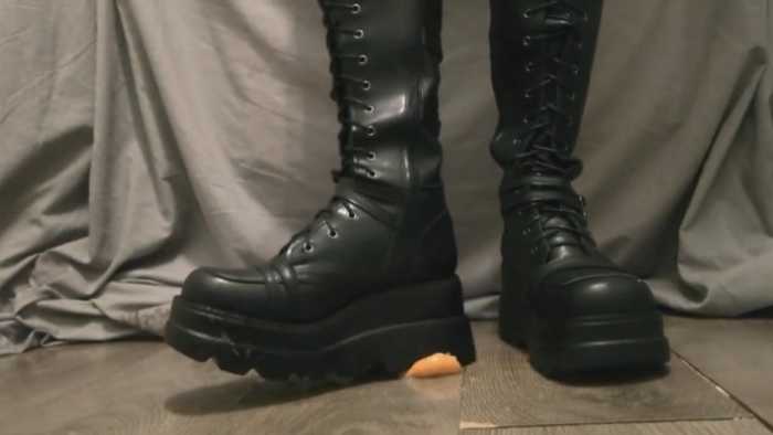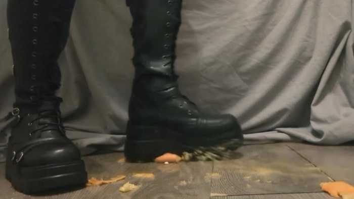 时隔一年多难得再约哥特美女,超级酷的两双长靴,爆踩橘子和香蕉,最后再加上一点饼干碎末,是不是一顿营养均衡的狗粮餐呢?