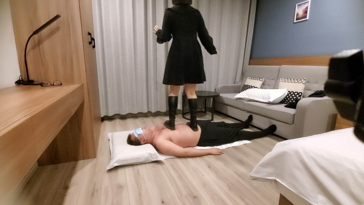 一部黑色长靴踩踏的库存,跟随音乐对毯子进行任意踩踏,即使毯子撑不住了也只能继续躺在地上苦苦坚持…一如既往的喜欢在毯子身上跟随音乐舞动,不停在毯子身上跳动,还助跑跳踩毯子,动作太快,截图都糊的。镜头角度丰富,也有对着镜头近距离展示鞋底的部分。