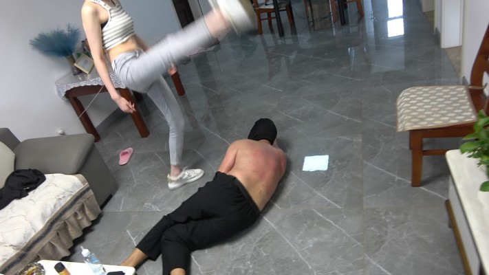 艾琳运动鞋暴踹贱狗,鞋跟狠磕后背磕出血红印,大力踹向肚子,暴力跺头,下劈腿砸狗头,声音响亮,藤条狠毒鞭打头部,抽打后背,贱狗疼得受不了用胳膊裆,可等来更狠的抽打,被抽的体无完肤,面对艾琳的狠毒贱狗祈祷快点结束!