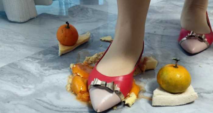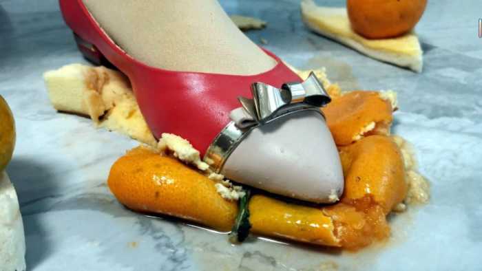 挑了一双平底鞋疯狂榨汁,踩了橘子和柠檬,汁水飙的丝袜上到处都是,踩碎的果肉还有切片面包混合起来,黏糊糊的一坨,踩起来真的又恶心又爽。