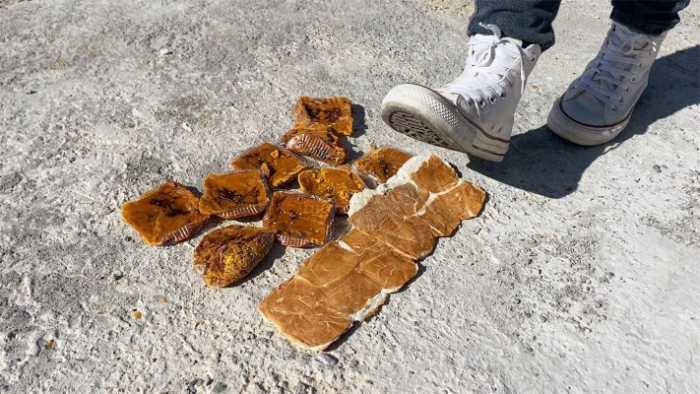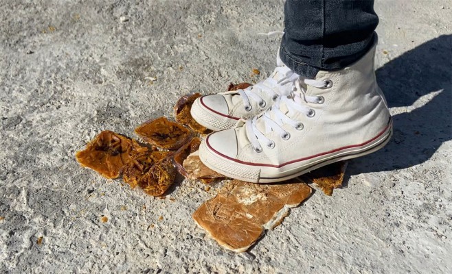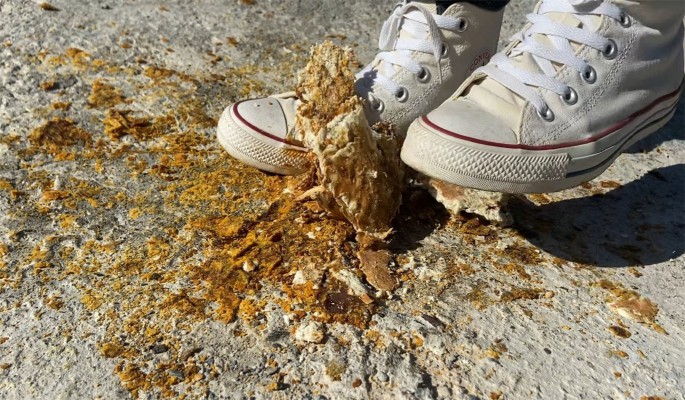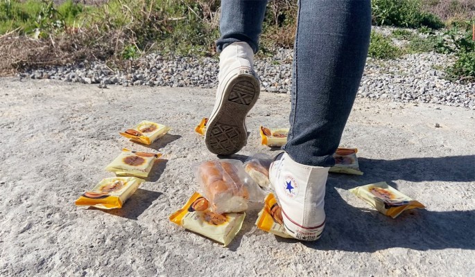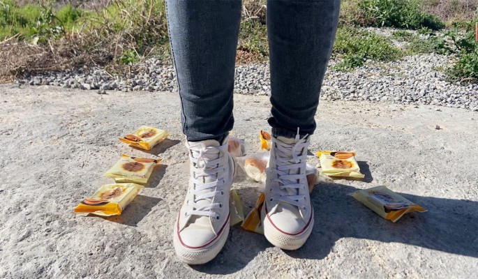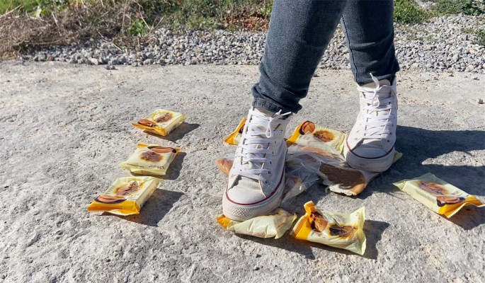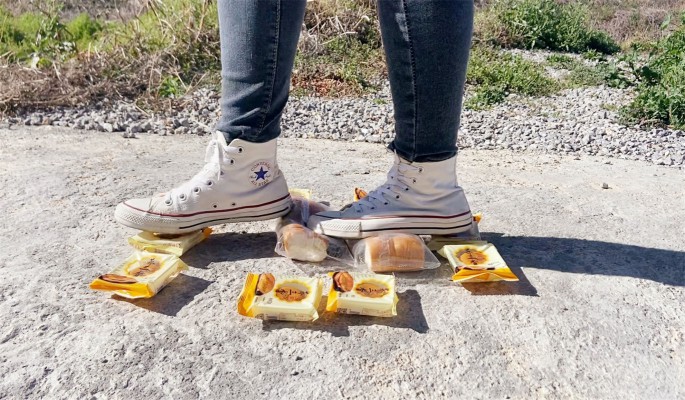 先反复走踩,直到把鼓鼓的包装带一下踩破,再用鞋子把食材从包装里扒拉出来,在食材上留下帆布鞋清晰的鞋印,之后在地上继续疯狂的一顿踩,直到最后鞋底沾满了黏糊糊的蛋糕和面包。