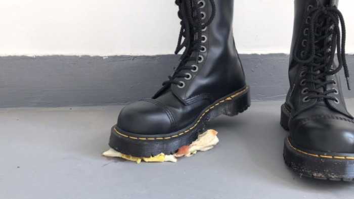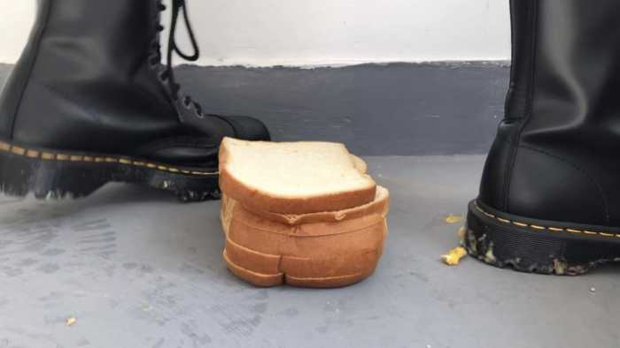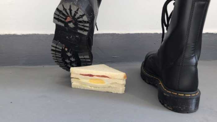 健身美女马丁靴楼道踩三明治香蕉面包制作狗粮 YC-250321-6