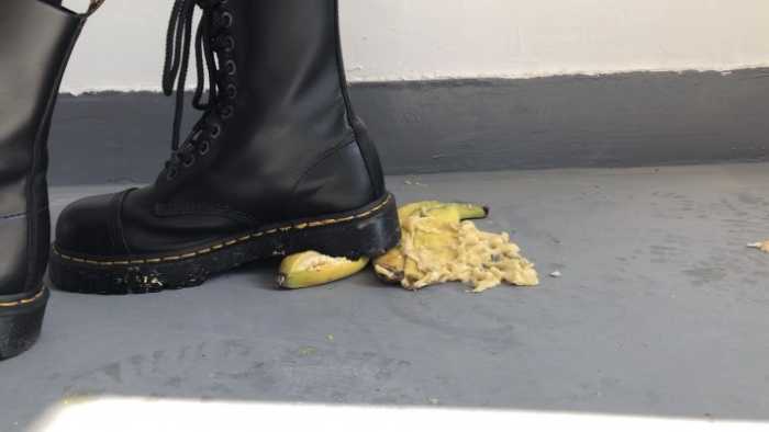 这次依然是楼道拍摄,健身小姐姐穿靴子非常酷,上次长靴这次是非常经典的马丁靴。这次的食材更丰富,夹心的三明治,香蕉和切片面包。最后面包上涂满香蕉泥,一定很美味吧