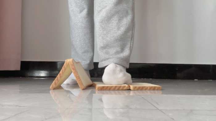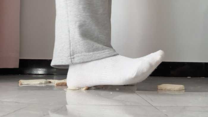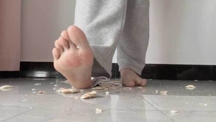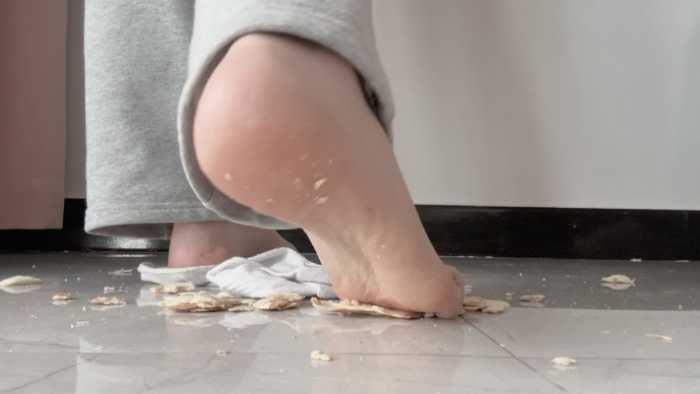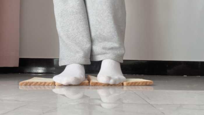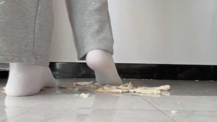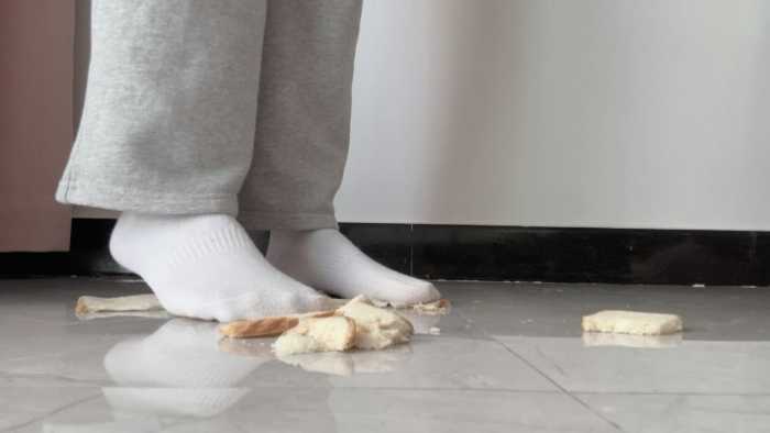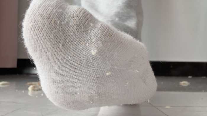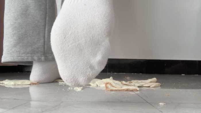 这双白棉袜可穿了好多天了,又脏又臭,穿着它狠狠的碾碎狗粮,再光脚把它和面包踩在一起,想必美味极了吧