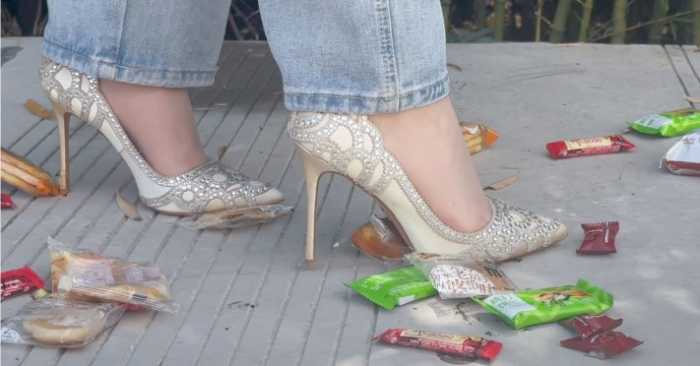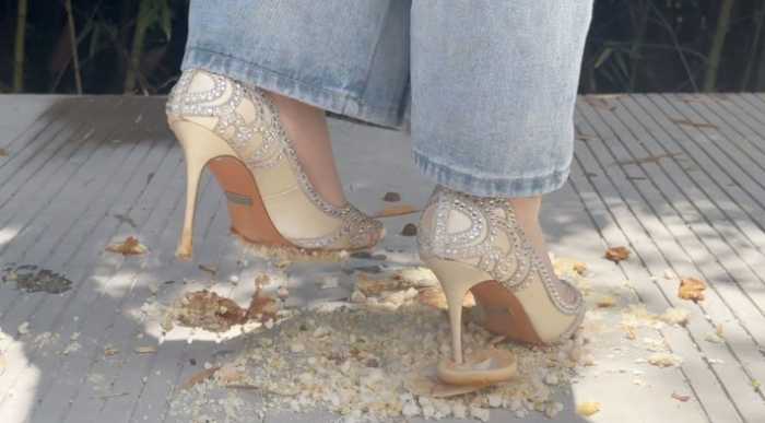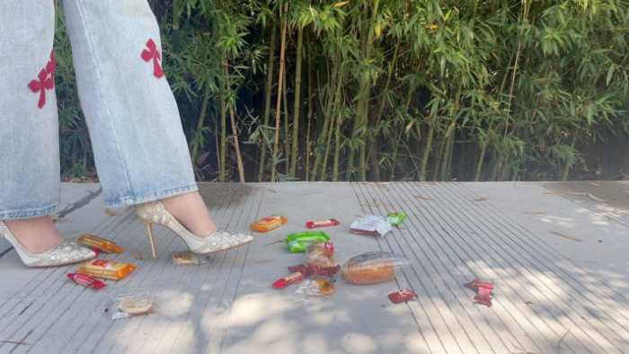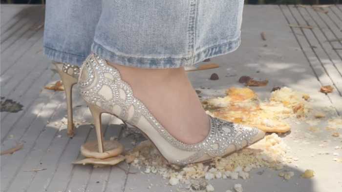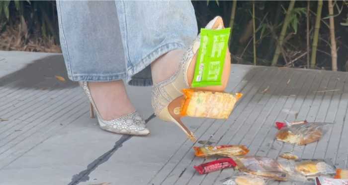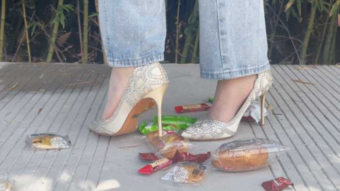 高贵优雅的15厘米银色细高跟户外踩零食大礼包,无意识踩踏、旋转踩、走踩、剁踩、挑踩多种踩踏手法,边踩边进行鞋底展示。