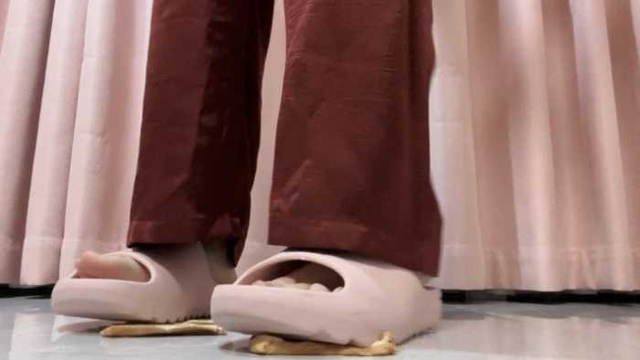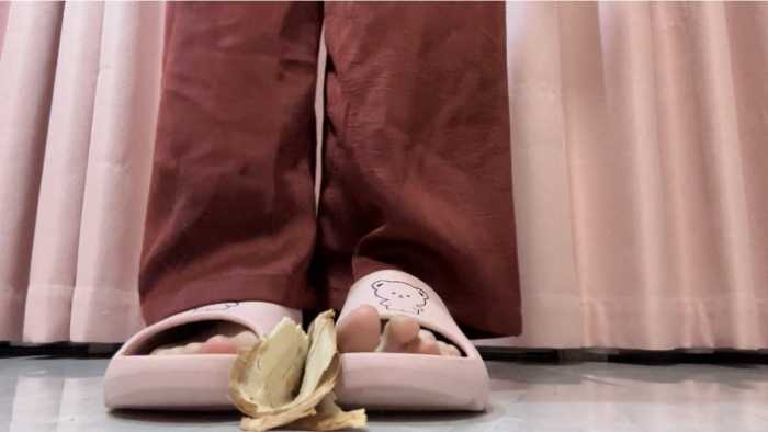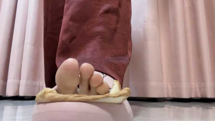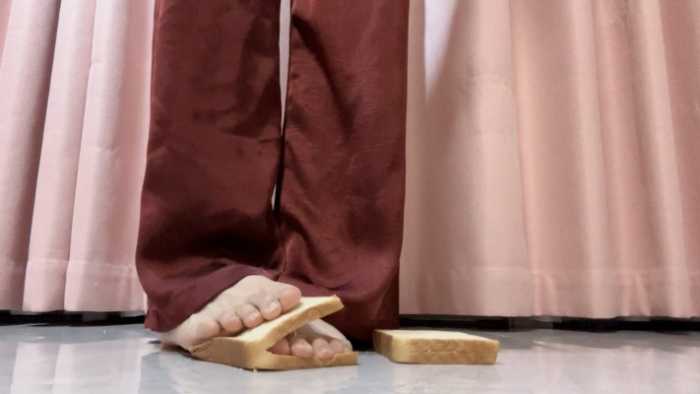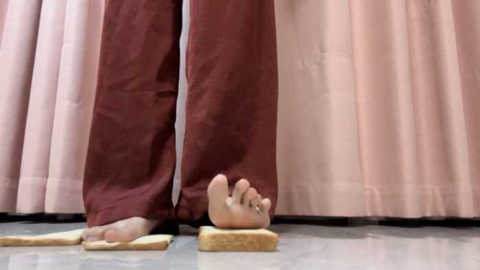 该怎么对待不听话的小狗呢?当然是制作狗粮奖励他啦。光脚在面包上踩踏,之后再当作鞋垫和脚垫碾压。闻闻看,香不香?