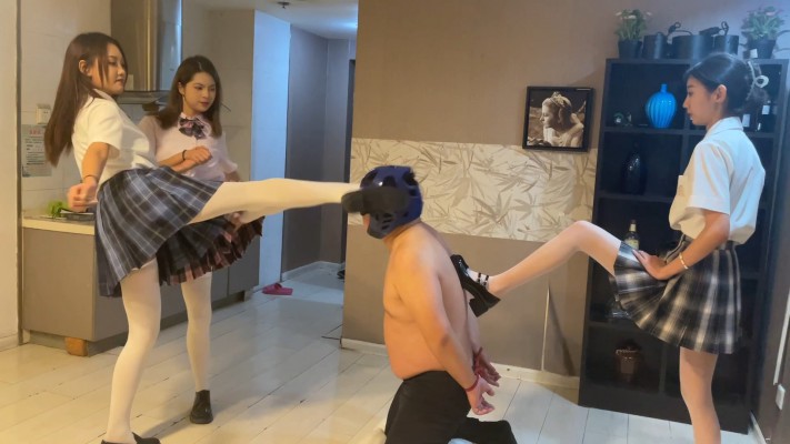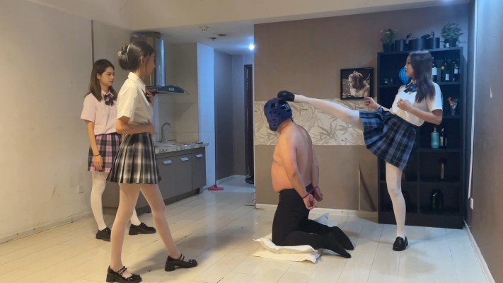 内容:三名身穿JK制服的女孩,以校园霸凌的方式欺辱一个蠢笨胖男生,强制其站立和跪下,三双硬质皮鞋的脚交替轮番的轰在头部上,即使带着防护头套,那击打的冲击力也是让男生几乎脑震荡般的击打感,几乎20分钟连续持续的头部暴踢,之后又进行了强制踢裆和腿绞虐乳,最后三位美女合力将男生踢昏死过去,踩着他自拍为乐,场面真的是暴力与美丽的交织。