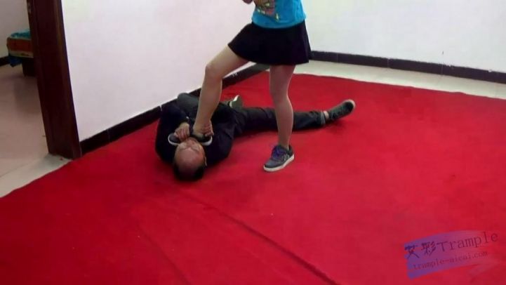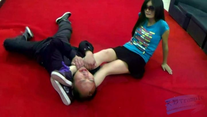 4、丽娜将扬再次踢倒在地上,让用用腿绞住他的脖子,紧接着开始抬起腿,再往下劈压扬的胸部和肚子,接着又换姿势夹住扬的脖子。