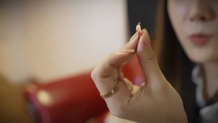 影姬先让小人们闻脚和按摩,再逼迫他们亲吻舔脚;接着逐个踩扁、压碎,还将脚放小人身上窒息,边踩边大笑羞辱。