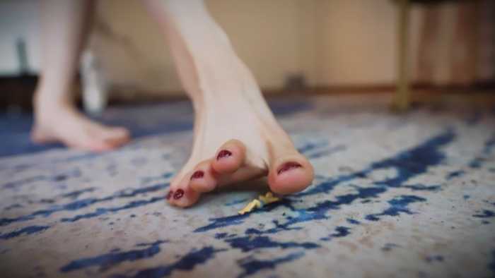 小人趁机逃跑,樱崎找到后,先抬脚踩踏、踮脚碾踩、脚趾夹放,再掀裙坐压扭动、用大腿夹挤。