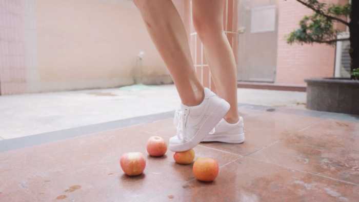 后面穿上鞋,用脚尖慢慢压碎苹果,用二头肌夹碎苹果,还用大腿肌肉发力夹碎西瓜。