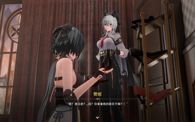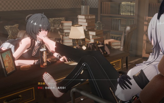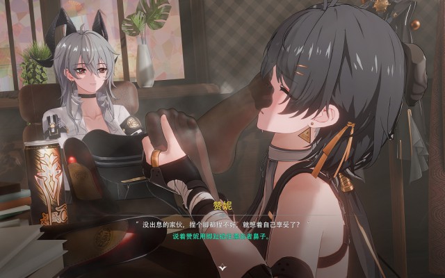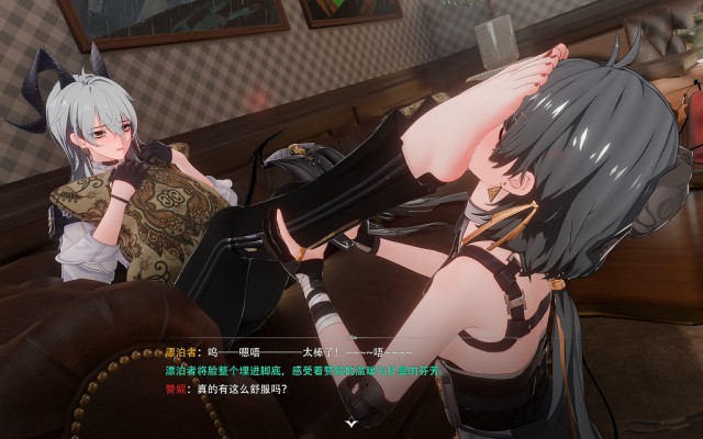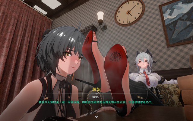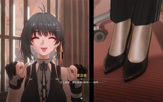 漂泊者(以下简称漂妹)身为“御者”本身是比“岁主”(相当于一个国家的神明)更加上位的存在,虽然漂妹失去了身为御者的记忆,但是她来到拉古纳之后仍然凭借强大的实力成为了拯救拉古纳的大英雄,拉古纳最大的家族之一“莫塔里”家族更是将漂妹作为贵宾招待,而赞妮作为“莫塔里”家族企业麾下的员工专门负责接待漂妹,赞妮的身手很好,她原本的工作是为家族处理各种棘手的麻烦,几乎每天都要在外面跑,跟各种敌人交手,作为一个上班族的她,一身职业装和高跟裤里丝是日常标配,漂妹很好奇:赞妮每天工作强度这么高,穿着这不透气的高跟鞋和薄薄的裤里丝,脚会不会很臭呢?况且赞妮经常会忙到晚上都没有时间回家睡觉,啊,这……这么说赞妮的鞋袜岂不是有可能穿几天都不换!于是漂妹趁赞妮外出偷偷溜进她的办公室,果然,没时间回家的赞妮直接把鞋子脱在了办公室里——这一鞋架的鞋子,一看就知道穿了好久啊!好奇的漂妹忍不住拿起一双赞妮常穿的红底高跟鞋扣在了脸上,嗯,没错,昨天赞妮接待她的时候还穿着这双高跟鞋呢,呜哇,这味道…… 就在这时,办公室的门被推开了,忙完工作回到办公室的赞妮恰好看到这一幕,漂妹无法解释,只好向赞妮坦白。此后,这位曾经的“御者”,“莫塔里”家族的贵宾,拉古纳人眼中的大英雄,在私下里却成为了赞妮小姐脚下的宠物,每天服侍赞妮辛勤工作之后的双脚……