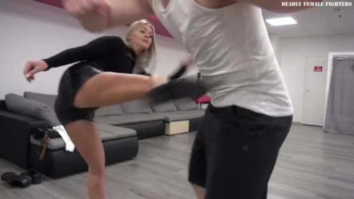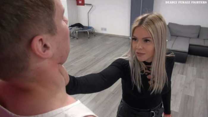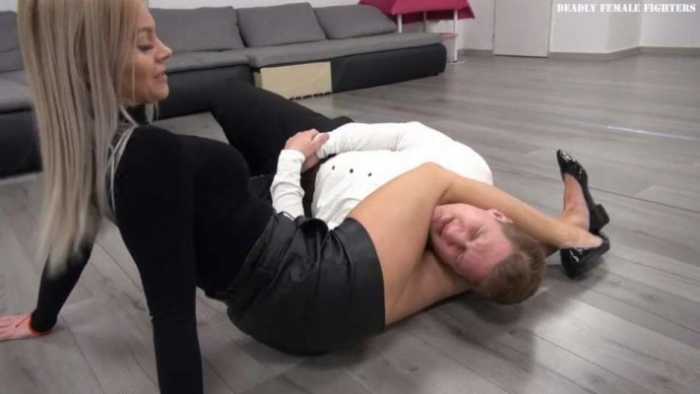 猎人在女王手里变成了玩物。腿绞 高控腿踢头 踢裆 踩脖子 手指插眼等等,精彩处有慢镜头回放。 最后男人被女王一脚踩死
