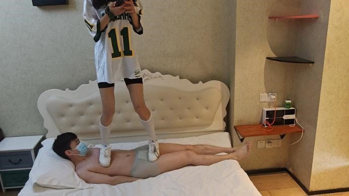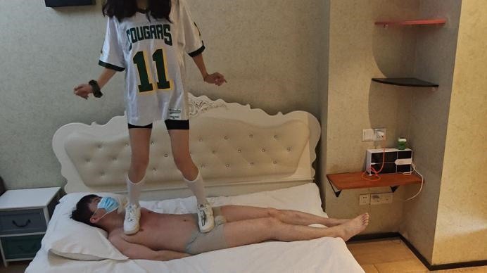 【影片预览及介绍说明】:自从上次在毯子身上跳舞之后,舞蹈小姐姐就沉迷上了,这次又来了,穿着一夏天的空军和三天的白丝就来了。各种在毯子身上跳舞,基本上都是踩在裆上,每次卡点就在裆上,丝毫不顾及毯子死活,感觉要被踩秃噜皮了,空军鞋底好硬,感觉别上次的靴子还要痛很多。