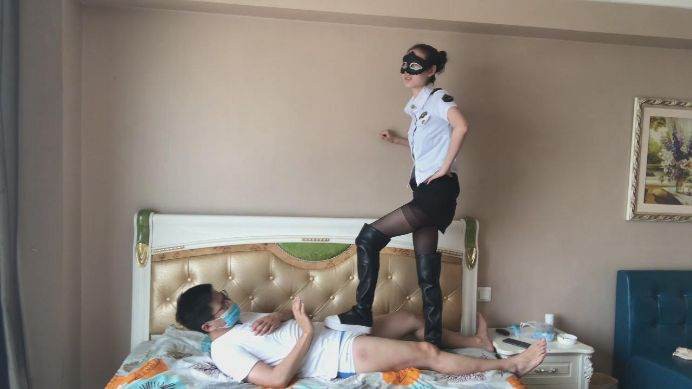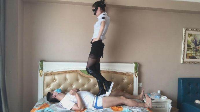 这个人真是不老实,经过那么多惩罚还是不交代,那就由我来好好的招待他吧。我用脚一边挑逗他的下面,一边质问他,他居然不屑一顾,我一记耳光加上狠狠一脚踢在他的dd上,他瞬间求饶了,原来是装坚强,加下来看我怎么收拾他,不一会全都交代了,但是我却忍不住继续虐待他,我狠狠地碾踩他的下面,就是为了发泄一下,尽管他多么痛苦。就在我一转身,他居然跑掉了,很快被我抓了回来,加下来可别怪我不客气,我全体重踩在他身上,集中对他的裆部碾踩,狠踢着,无奈脚在靴子里出汗了,那么我就脱下靴子,黑丝脚踩他的脸,还要折磨让他更加痛苦!