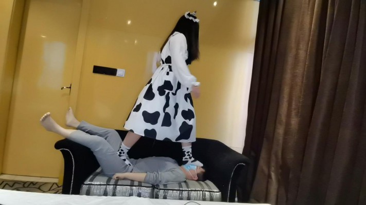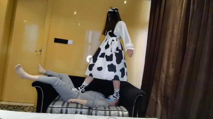 【小鹿】奶牛萝莉裙+奶牛棉袜,踩脸踩裆散散步