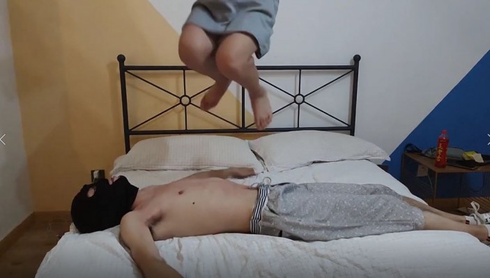 小姐姐在家待着感觉有点无聊所以打算活动活动,叫家奴躺在床上准备做运动,刚开始先试探性的踩在家奴身上让家奴熟悉一下体重,然后开始全体重跳踩,单脚用力跺肚子,踩在家奴身上快速原地踏步躺在小姐姐两腿之间连续跳踩不给家奴一丝喘气的机会,最后小姐姐跳累了全体重踩踩头