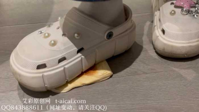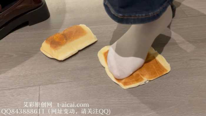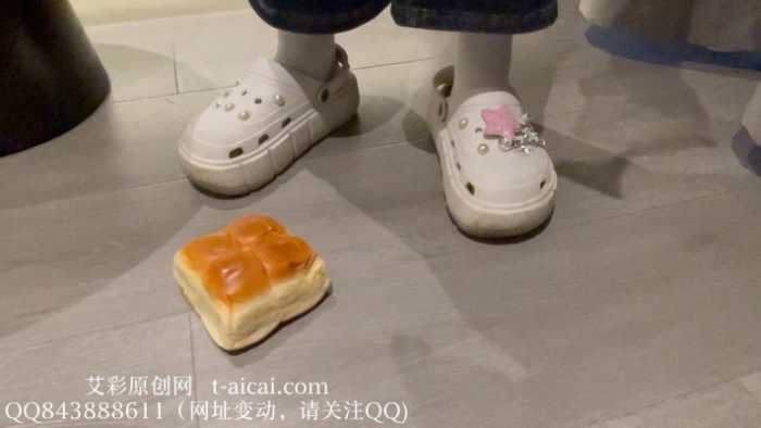 静琪在给狗子准备今天的晚餐,依次穿着洞洞鞋,皮鞋和白袜踩面包,最后把面包放进鞋里当鞋垫。