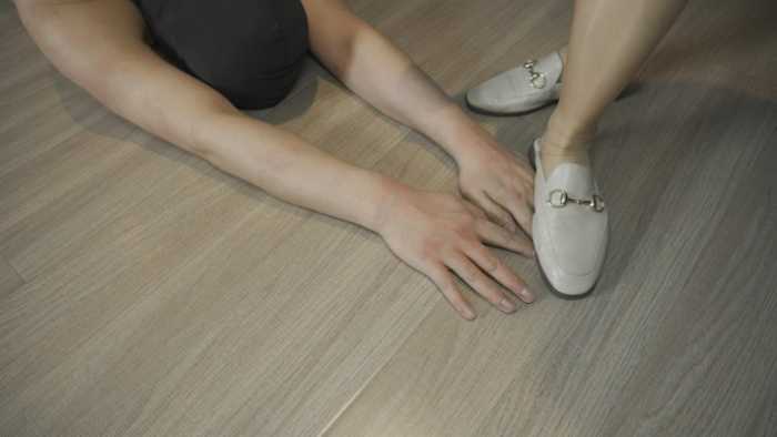 长靴来回溜达无意识踩手,平底鞋放音乐在手上练习跳舞,来回蹦哒,高跟鞋细跟翘起踩手,贱狗的手十指连心剧痛。