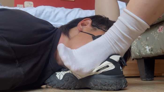 主人穿着棉袜走了一天,袜子都被汗浸黄了,贱奴对主人脚汗的味道越来越迷恋,已经能够熟练用嘴为主人脱鞋了,那就赏赐他大口吸闻脚味,品尝每一滴脚汗。今天一如既往地把贱奴插吐,嘴和主人脚磨合的越来越好,没有之前那么容易咬脚了。感觉贱奴被插喉咙好舒服的样子,主人的脚趾必须用他喉咙来做保养。