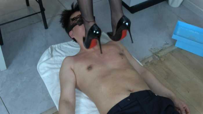 服务员趁试鞋过程多次故意揩油美女顾客,顾客发现后威胁举报,服务部被迫妥协被虐,玉足掐乳扎乳,高跟鞋踩踏乳头,服务员很痛苦,美女顾客丝毫不怜悯,开心的踩着乳头,辱骂着服务员。